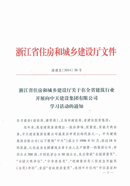 《浙江省住房和城乡建设厅关于在全省建筑行业开展向美狮贵宾会建设集团有限公司学习活动的通知》